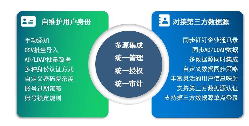云涌零信任安全管理平臺既支持主流企業(yè)通訊錄系統(tǒng)的數(shù)據(jù)導(dǎo)入與同步,也支持自建用戶體系。實(shí)現(xiàn)了在一個平臺對企業(yè)人員、部門以及角色組的統(tǒng)一高效管理。同時系統(tǒng)提供多種用戶認(rèn)證方式,全方位滿足各種需求場景。