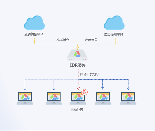 平臺針對安全風(fēng)險較高的場景(如終端上報了高危安全事件,或觸發(fā)了特殊的安全策略)可以快速響應(yīng)并自動下發(fā)處置措施,及時阻斷已知、未知或高級威脅,全面防護(hù)企業(yè)終端安全。
