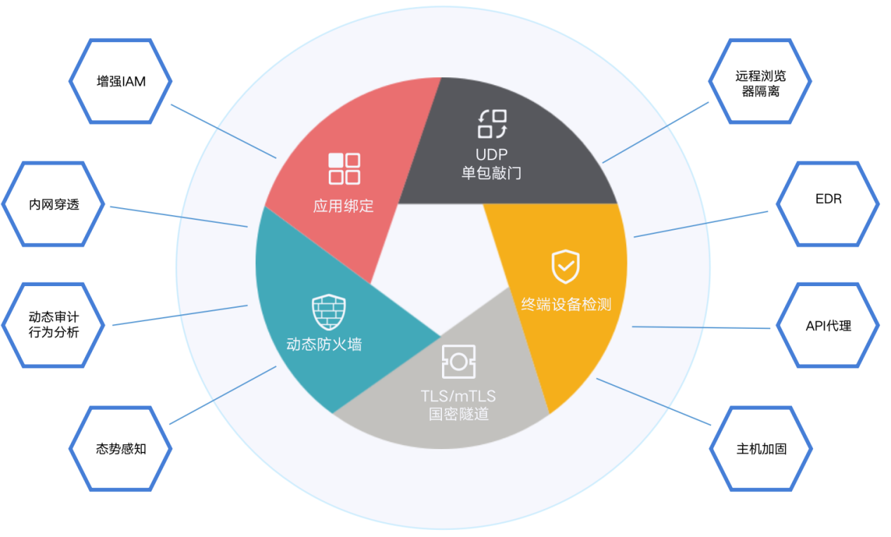 ? ? ? 本方案融合了當前最新的安全技術通過聯動的安全矩陣設計,形成一個整體的安全閉環。安全矩陣主要包括:SDP安全框架,遠程瀏覽器隔離,增強IAM, 端點檢測與響應EDR,邊緣微隔離,內網穿透,動態審計與行為分析,態勢感知,API代理、主機加固與可信計算。