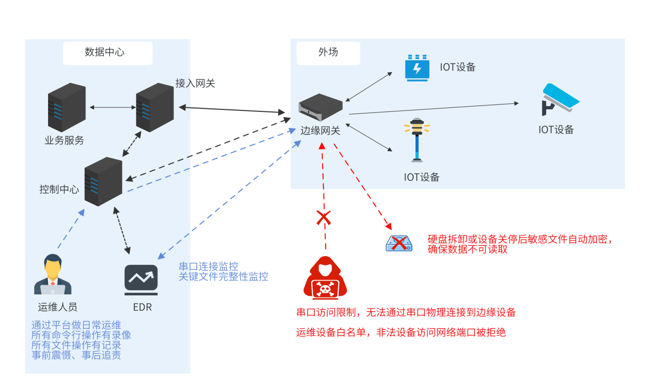 平臺由邊緣網關代理程序、網關離線運維工具、控制中心、接入網關、應用倉庫等模塊組合而成。產品核心功能包括邊緣網關身份認證、網關出入站訪問控制、網關間微隔離控制、邊緣應用管理、網關安全運維、網關數據存儲透明加解密等。同時平臺保護網關與北向數據中心的訪問安全,包括端口隱藏,通訊加密等。