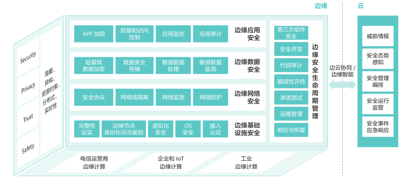 邊緣安全是邊緣計算的重要保障。邊緣安全涉及跨越云計算和邊緣計算縱深的安全防護體系,只有增強邊緣基礎設施、網絡、應用、數據識別和抵抗各種安全威脅的能力,才能為邊緣計算產業的發展構建安全可信環境。邊緣安全的核心價值體現在可以提供可信的基礎設施:主要包括計算、網絡、存儲類的物理資源和虛擬資源?;A設施是包含路徑、數據交互和處理模型的平臺面,可以應對鏡像篡改、DDoS 攻擊、非授權通信訪問、端口入侵等安全威脅。