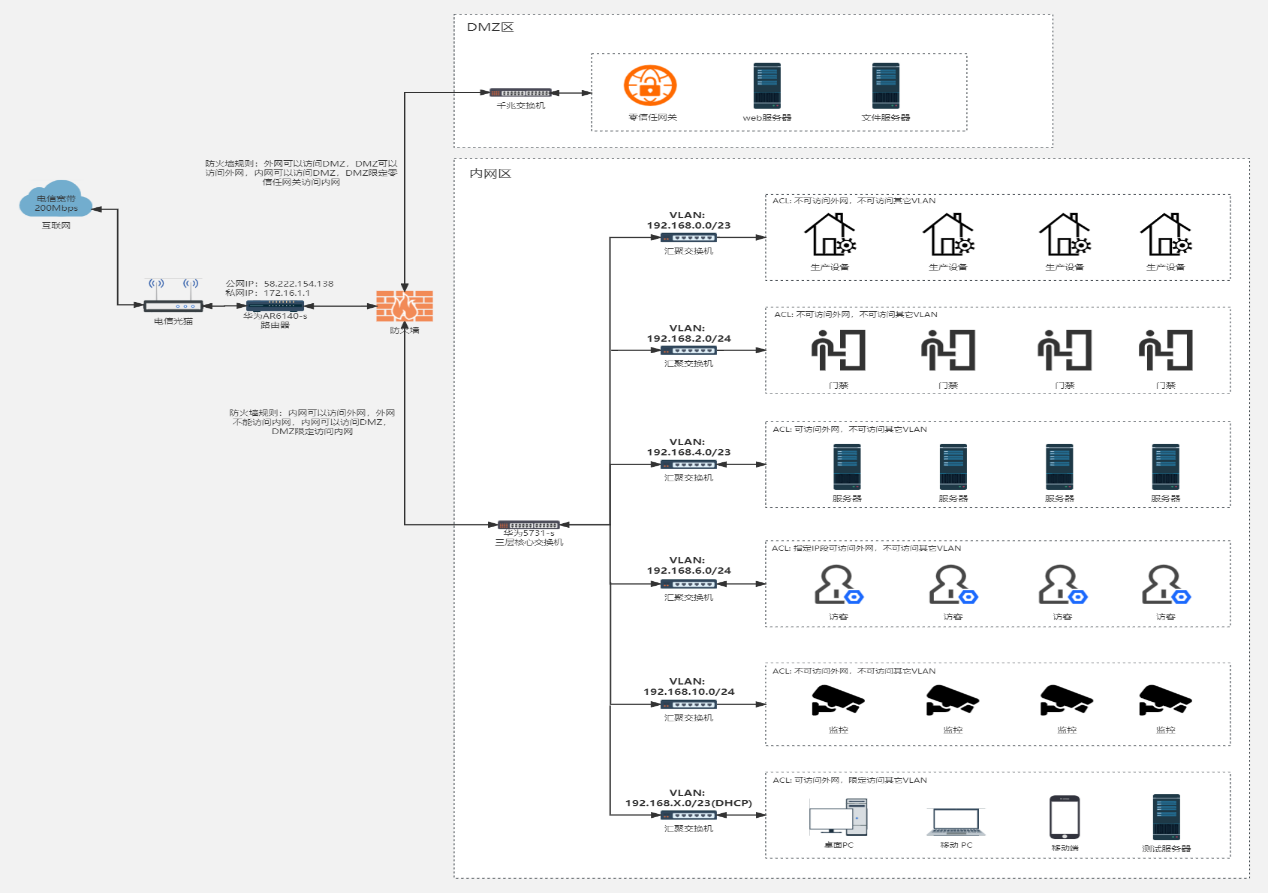 ? ? ? 其次,為了解決內(nèi)網(wǎng)安全隱患,根據(jù)業(yè)務類型和部門劃分不同的VLAN,各VLAN之間的通過ACL策略進行合理的訪問控制。同時建立DMZ區(qū),DMZ區(qū)用來放置必須公開的服務器資源(如企業(yè)Web服務器、文件服務器、論壇等)和零信任網(wǎng)關,外網(wǎng)、DMZ和內(nèi)網(wǎng)之間通過防火墻進行隔離。
