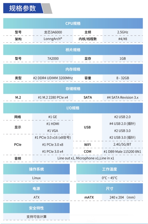 由云涌科技推出的基于3A6000的系列產(chǎn)品,采用4核處理器構(gòu)建,主頻2.5GHzo,搭配7A2000橋片,1GB獨立顯存,支持2路UDIMM3200DDR4內(nèi)存條,支持M.2接口,可作為小容量固態(tài)系統(tǒng)盤使用,應(yīng)用于家用娛樂、商務(wù)辦公等場景。