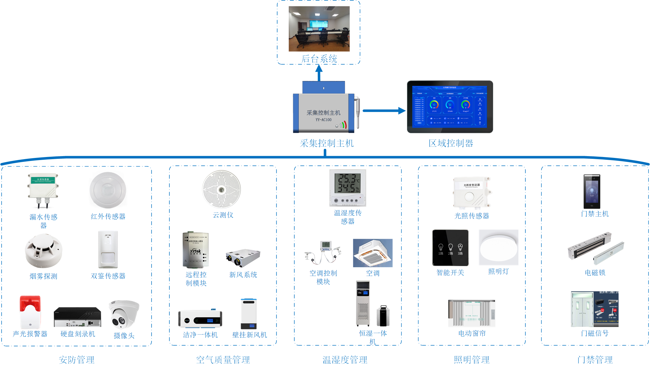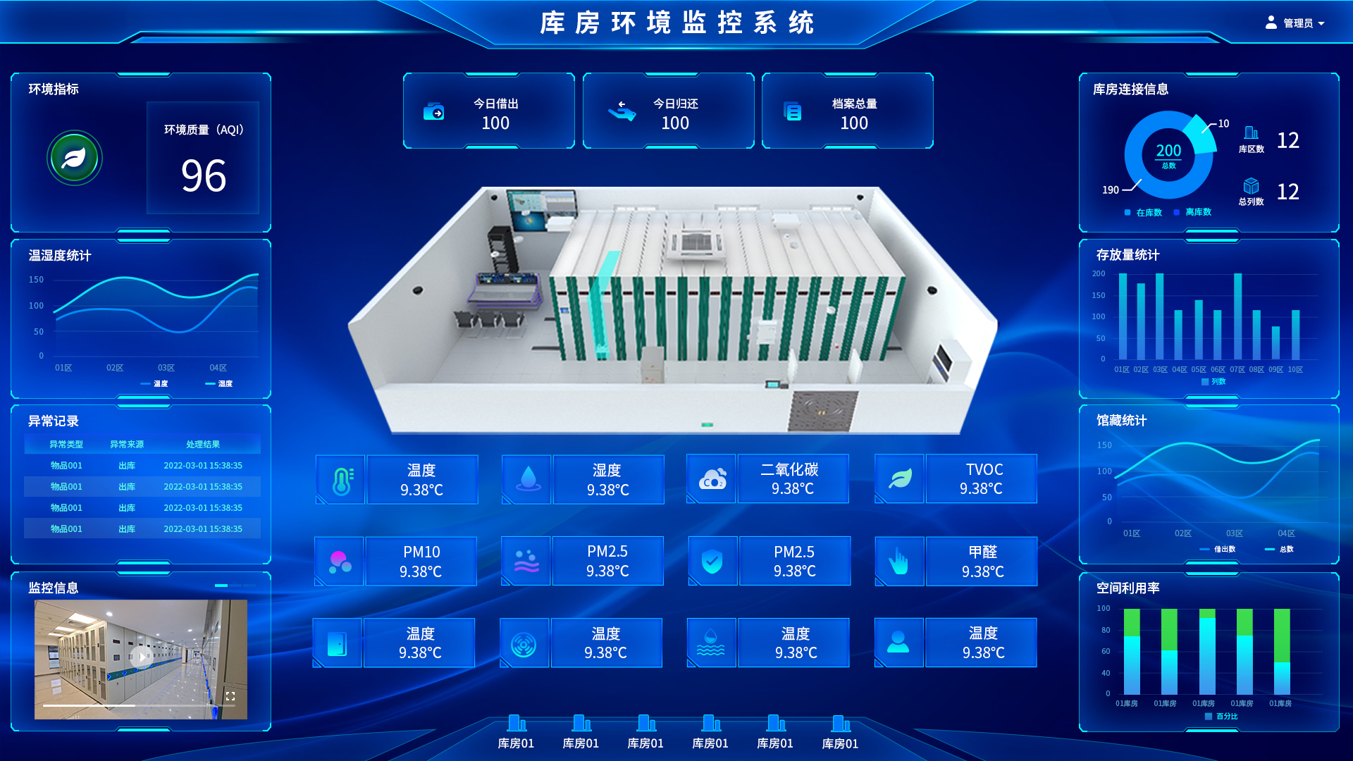 云涌科技智能環境控制綜合管理系統通過智能設備采集所有庫房內的溫度、濕度、漏水、人員侵入等數據,并通過自動模式控制空調、除濕加濕凈化一體機、電動窗簾、燈光、新風機等智能設備,達到自動調節溫濕度及空氣凈化的目的,實現了庫房內空氣質量的智能管理,保護了檔案本身安全和從業人員的身體健康。同時接入視頻監控系統,實時監控檔案庫房實時內畫面;出入口部署門禁控制設備,通過指紋、門禁卡、密碼等方式控制人員的進入,只有有權限的管理人員才能進入,有效保證檔案實體的安全。